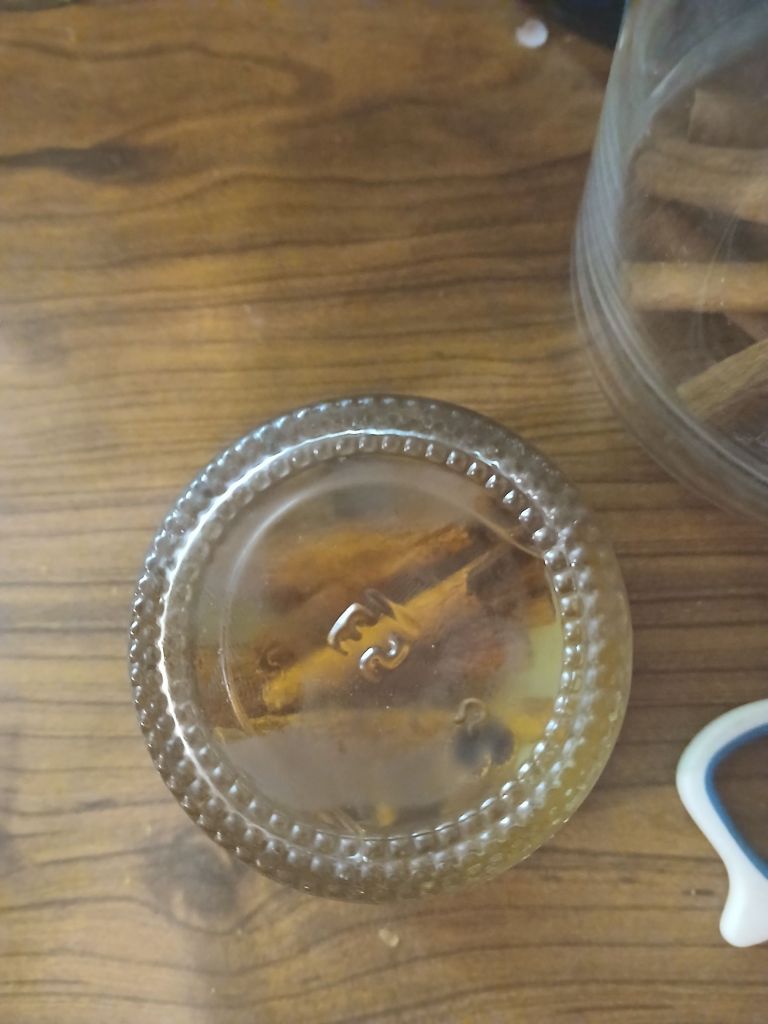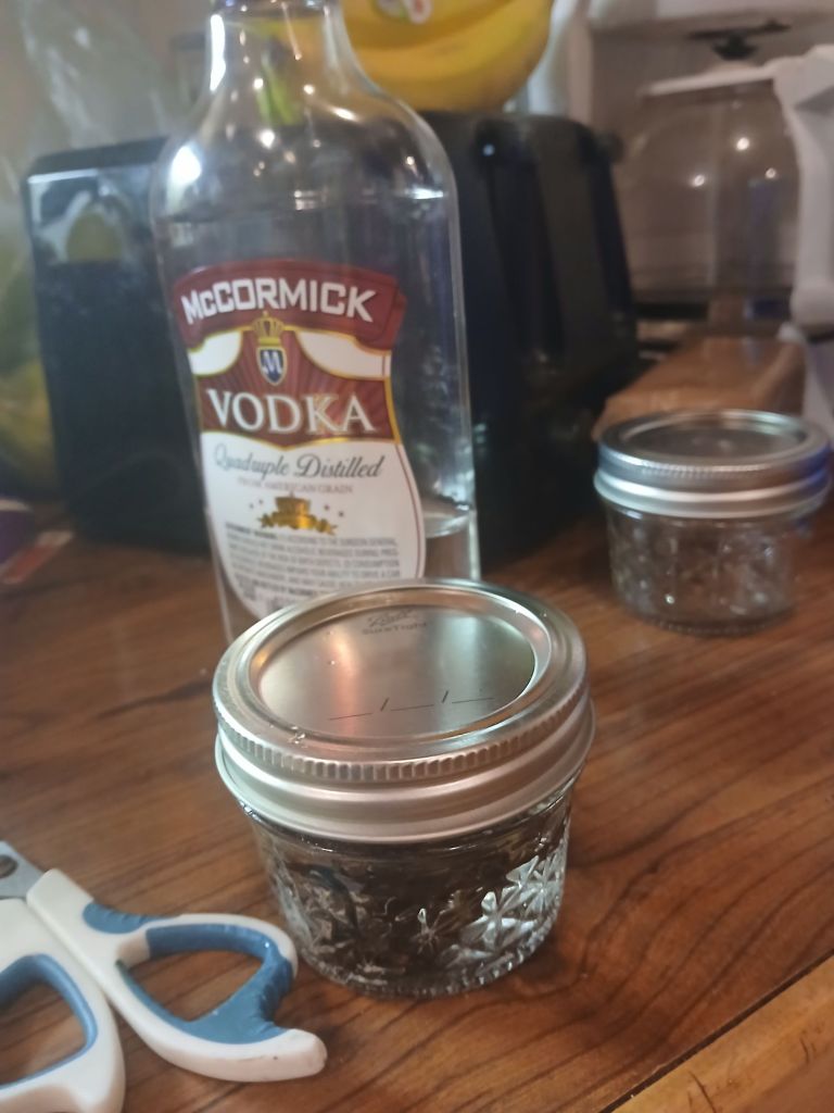 I had enough vodka left so I took 3 full cinnamon sticks and Dev broke them into small enough whole peices(not crushed) to fit into my 4 oz jar then filled that jar with vodka and sealed it as well.