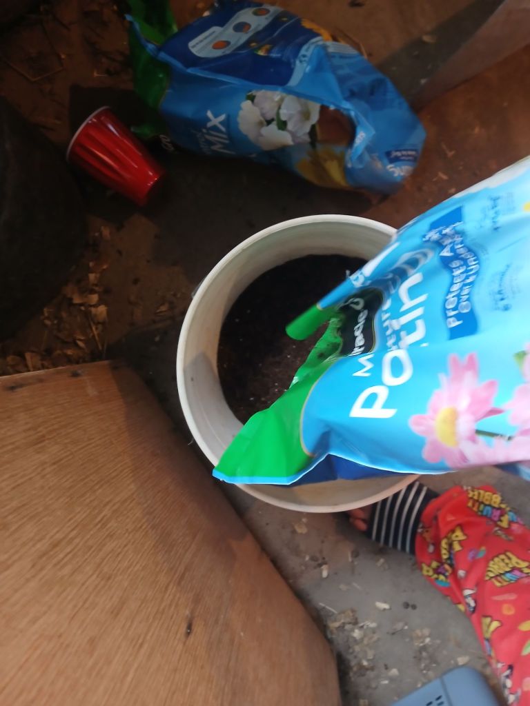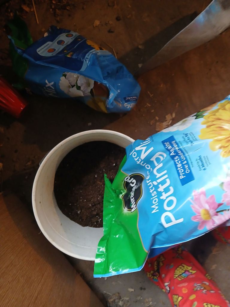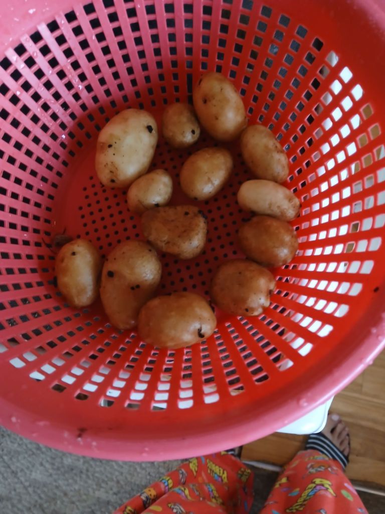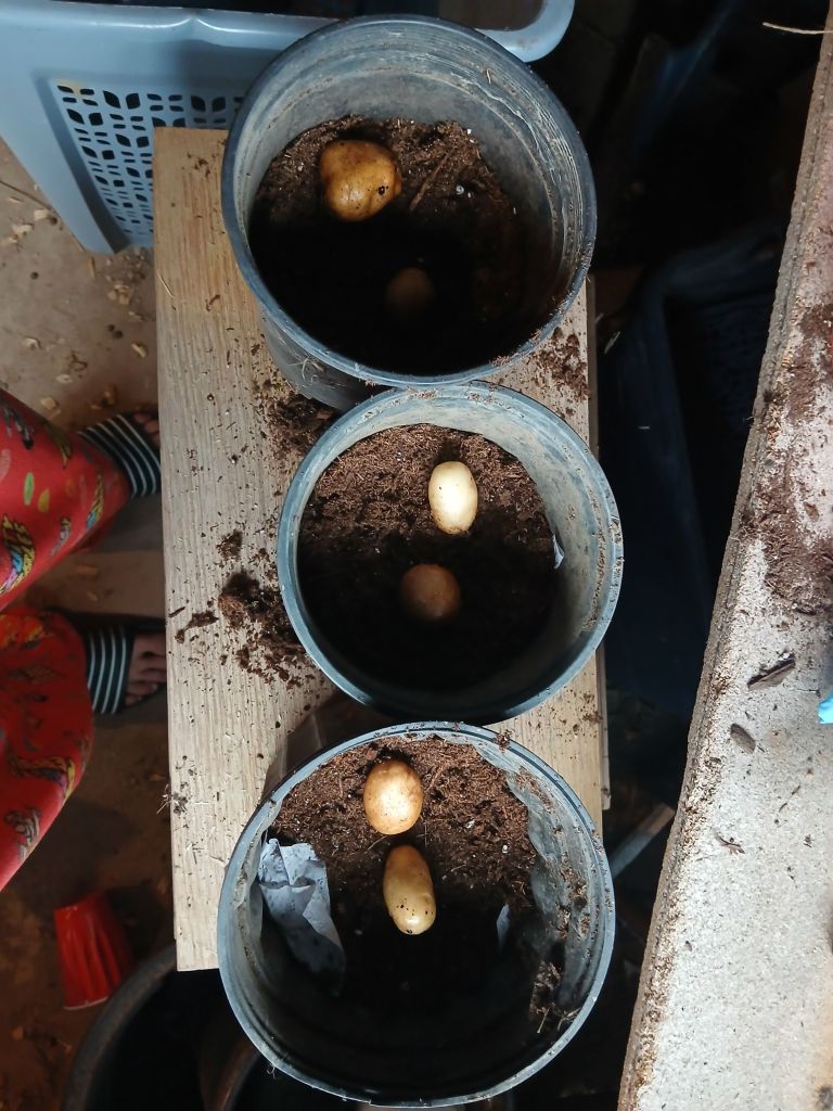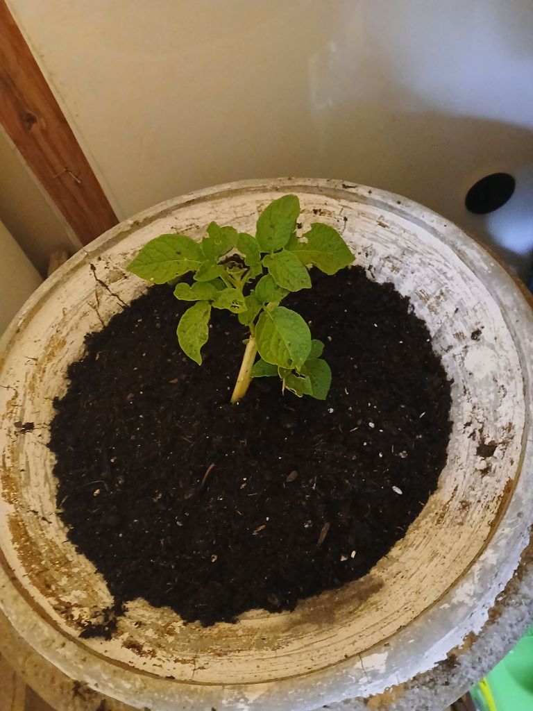 We let the kids claim it so they watered it and asked for help when needed. It got pretty big leaves then the deer ate the leaves and they were sad. . . it wasnt dead yet so I babied it for the rest of summer .Harvest time came so we dug it up to repot and found so many tiny potatos.